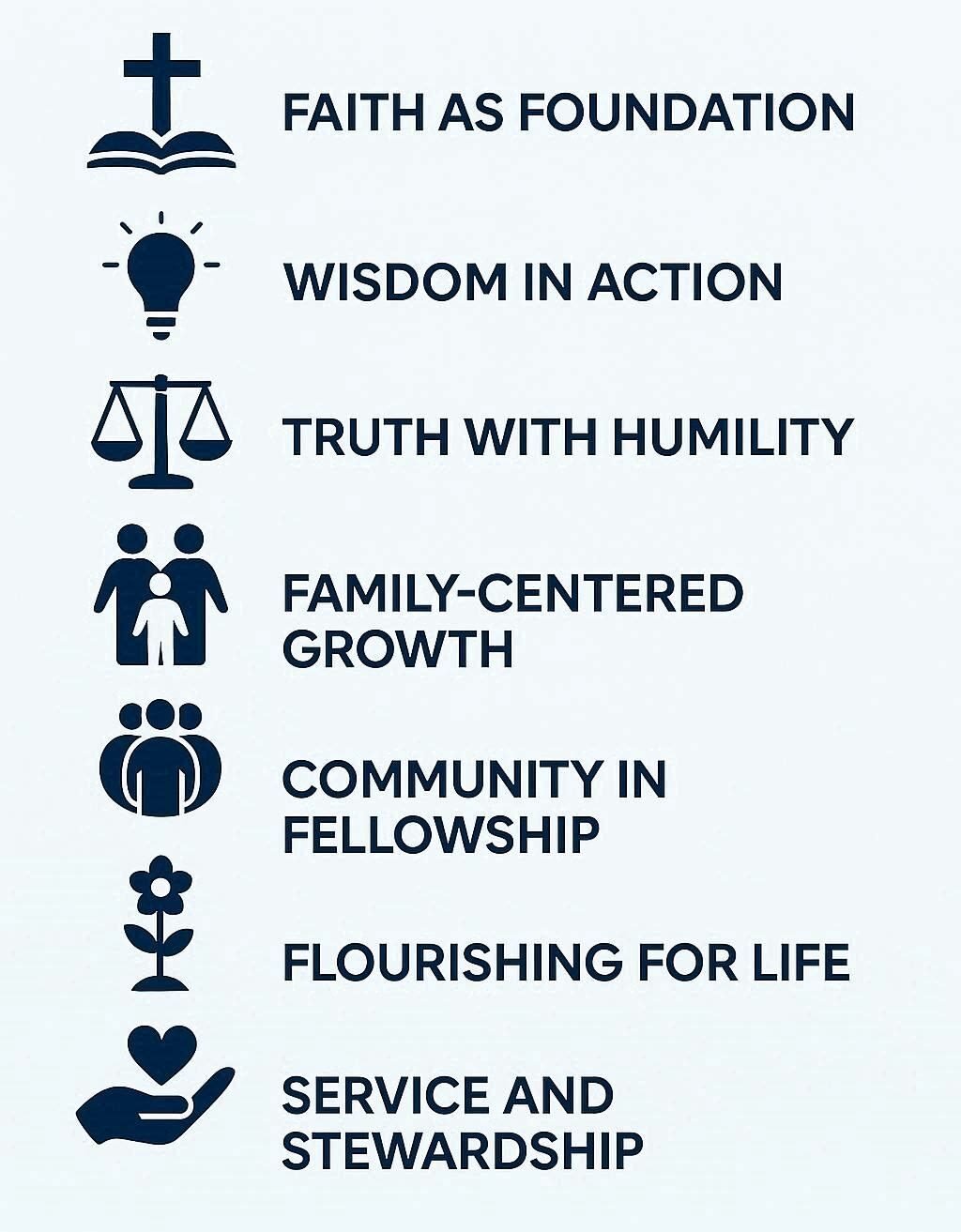 By fostering an environment where knowledge is pursued with humility and faith shapes understanding, we help families flourish—developing not only informed minds but also grounded hearts, ready to live with purpose and compassion in the world.